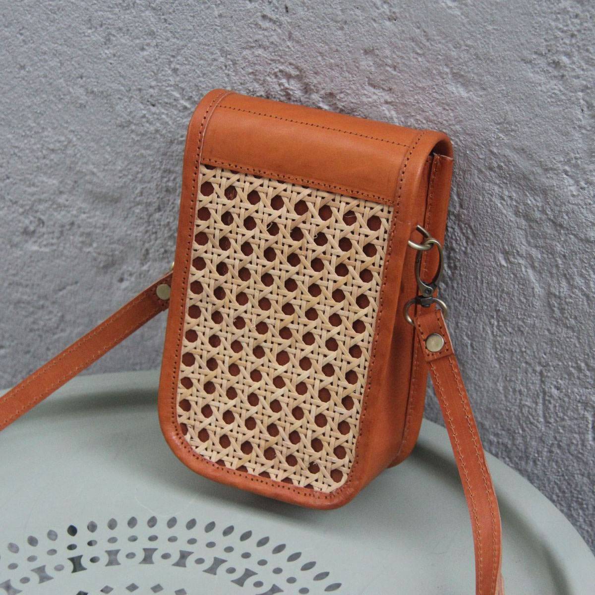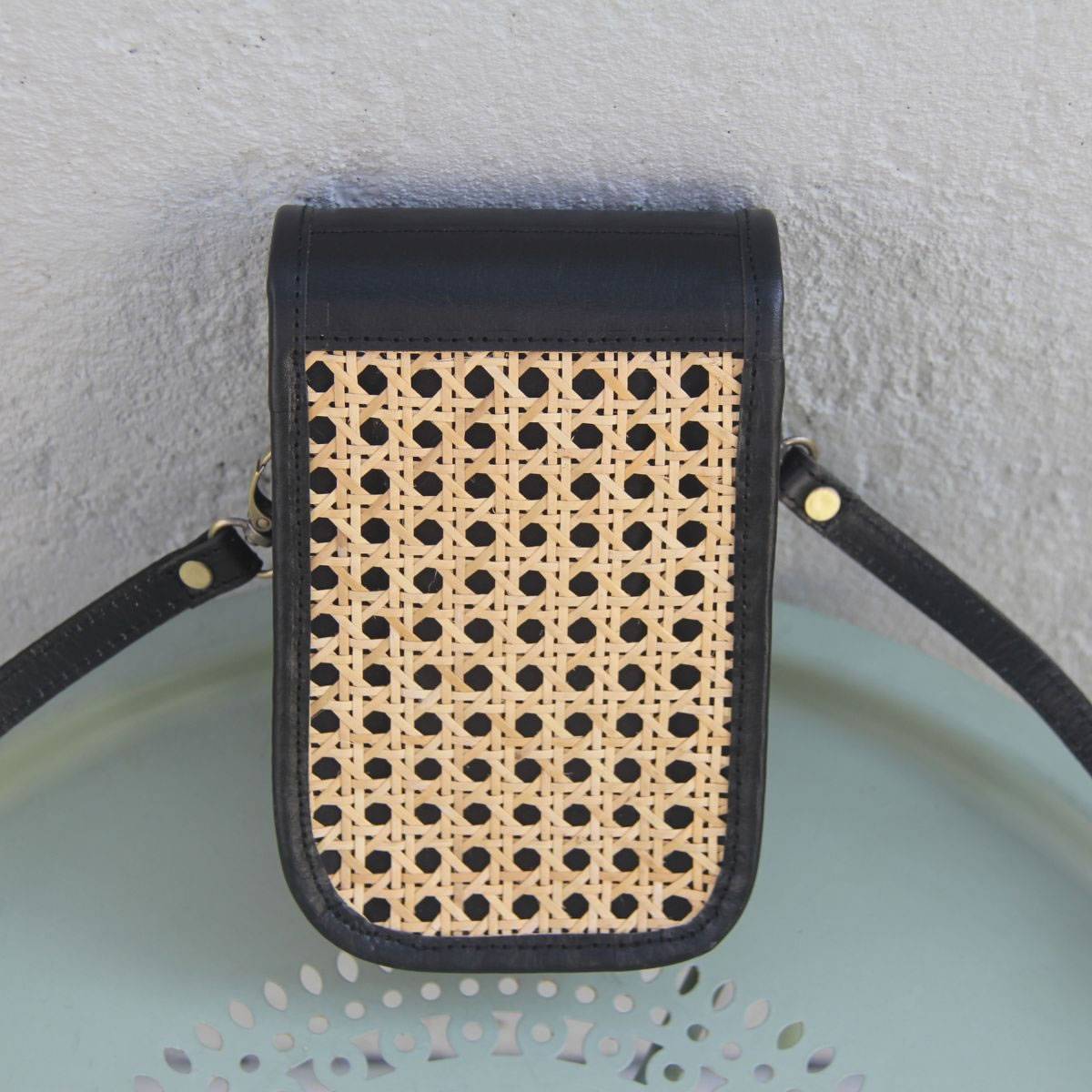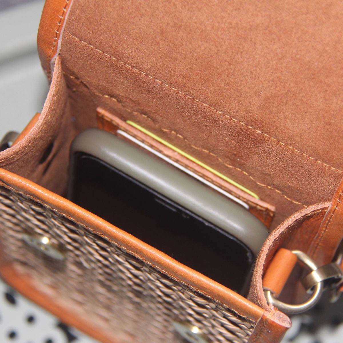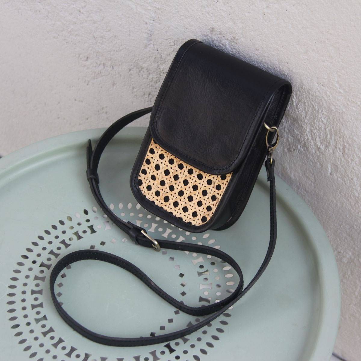 Enhance your accessory collection with our handmade rattan cane and real leather mini phone bag, designed to combine style and practicality. This chic mini bag is perfect for carrying your phone and small essentials, making it an ideal addition to your everyday outfits, quick outings, errands, or adding a touch of elegance to your look.